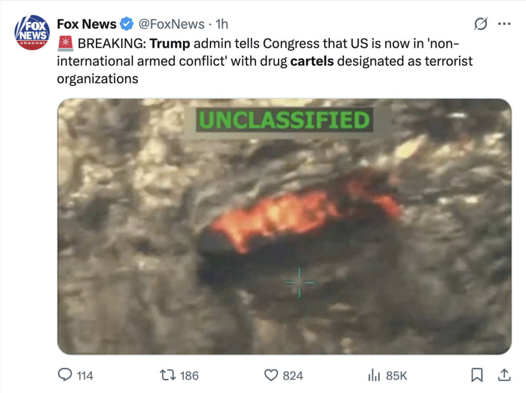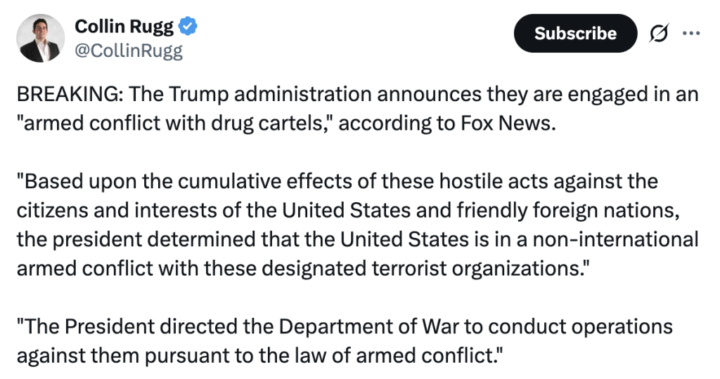 “They illegally and directly cause the deaths of tens of thousands of American citizens each year,” the memo continued. “Although friendly foreign nations have made significant efforts to combat these organizations, suffering significant losses of life, these groups are now transnational and conduct ongoing attacks throughout the Western Hemisphere in the form of organized cartels. Therefore, the President determined these cartels are non-state armed groups, designated them as terrorist organizations, and determined that their actions constitute an armed attack against the United States.”