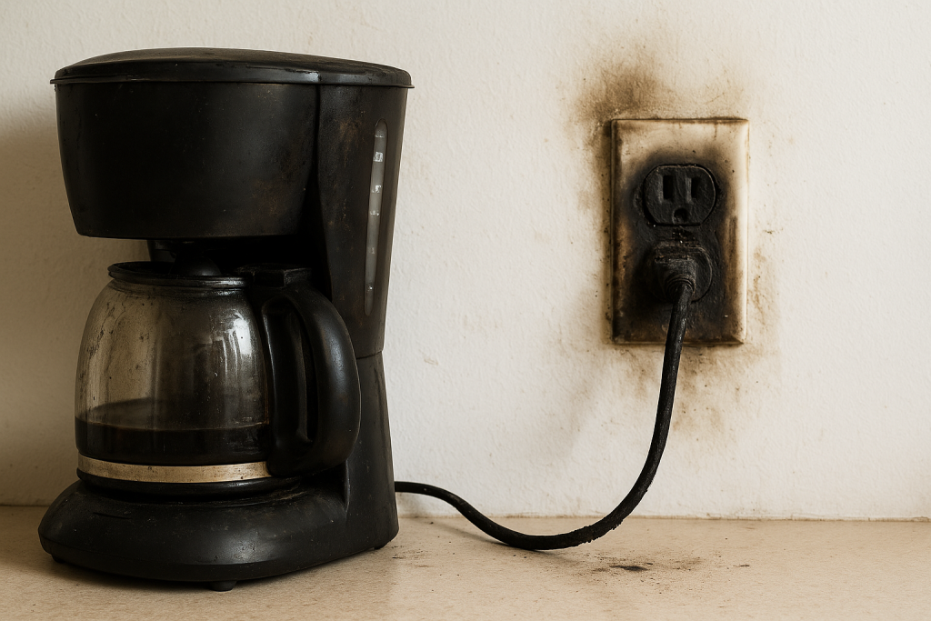 So, I posted a photo (the one my electrician showed me)—a half-melted coffee maker, its cord fused to a blackened outlet.