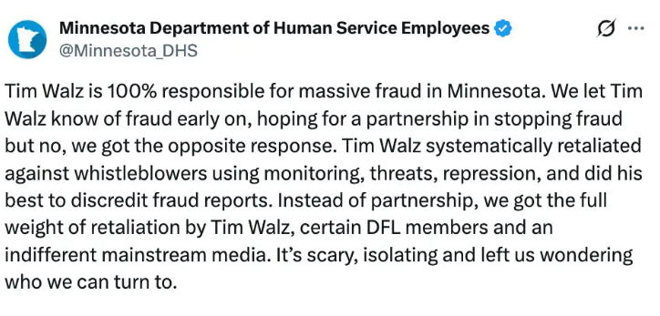 “Tim Walz is 100% responsible for massive fraud in Minnesota. We let Tim Walz know of fraud early on, hoping for a partnership in stopping fraud but no, we got the opposite response,” the Minnesota DHS employees’ X account, representing over 480 workers, wrote Saturday.